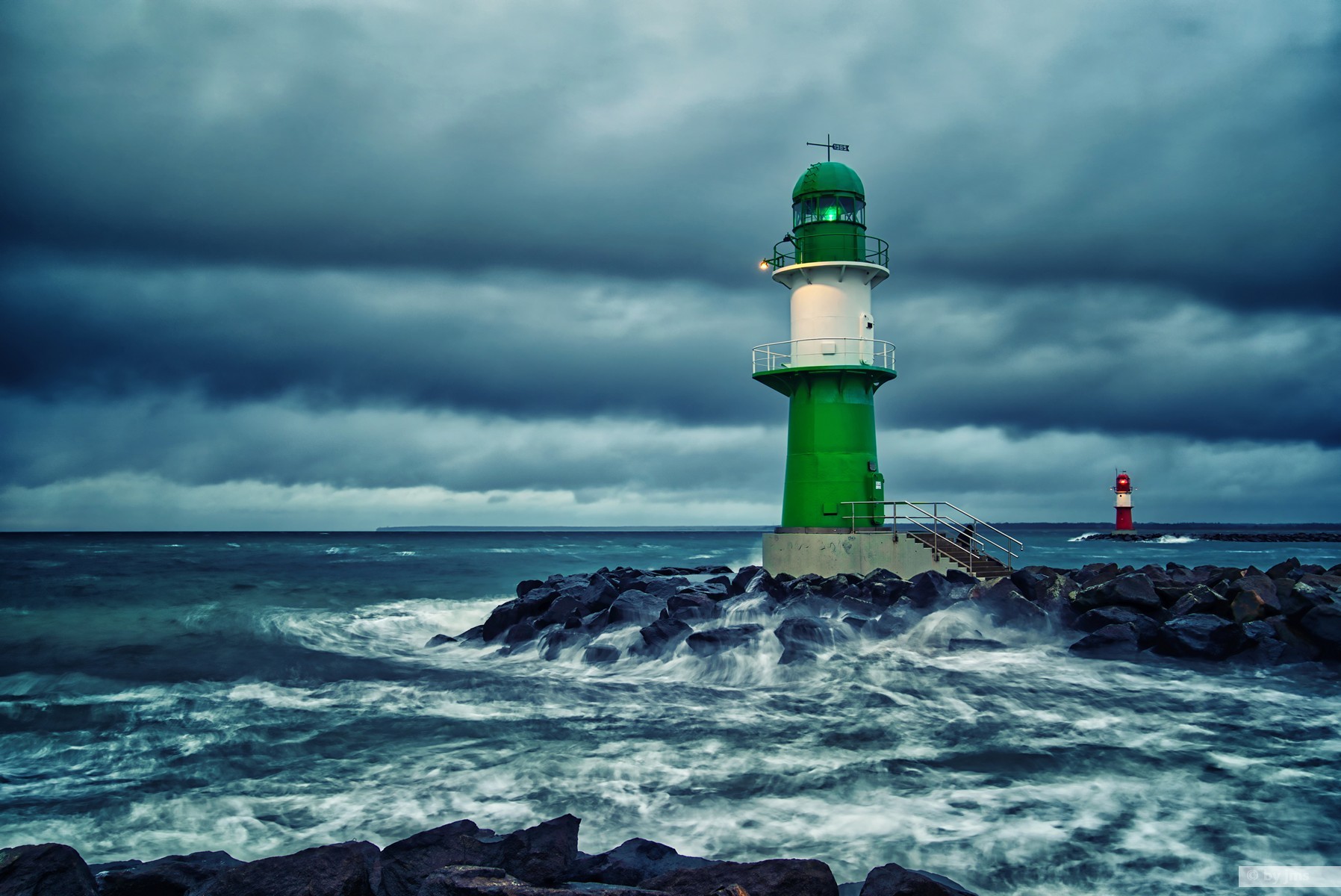 - Deutschland, Leuchtturm, Rostock, Wellen