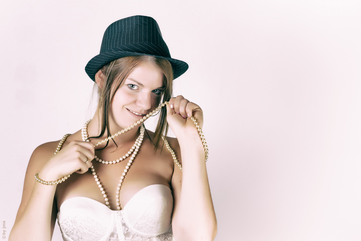- Corsage, Dekolltee, Hut, Perlenkette, Portrait